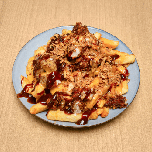 Base de frites avec nos morceaux de Tenders croustillants maison, sauce cheddar maison, sauce BBQ fumée Usa & oignons secs.
