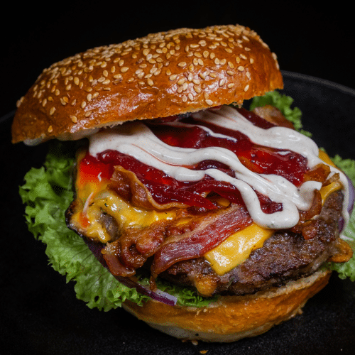 Pain bun, double steak de 150gr, cheddar, 2 onions rings, 1 galette de pomme de terre, 1 croquette de fromage, bacon grillé, salade, oignons rouges, tomate, cornichons, Sauce Steak stout & Sauce Sauce Sweet Pikle Relish